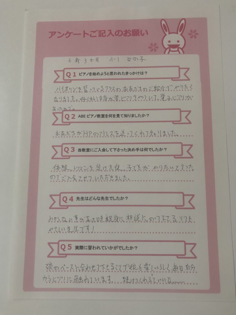 娘のペースに合わせて下さることで娘も楽しいらしく、毎日、自分からピアノに触れています。続けてくれるといいな~